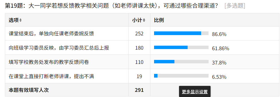 教学反馈渠道的调查中,86.6% 的学生选择课堂结束后单独向任课老师委婉反馈问题,61.86% 的学生通过班级学习委员汇总上报,37.8% 的学生会填写教务处教学反馈问卷,而仅6.53%的学生选择在课堂上直接打断老师,说明新生普遍掌握了合理的教学反馈方式。