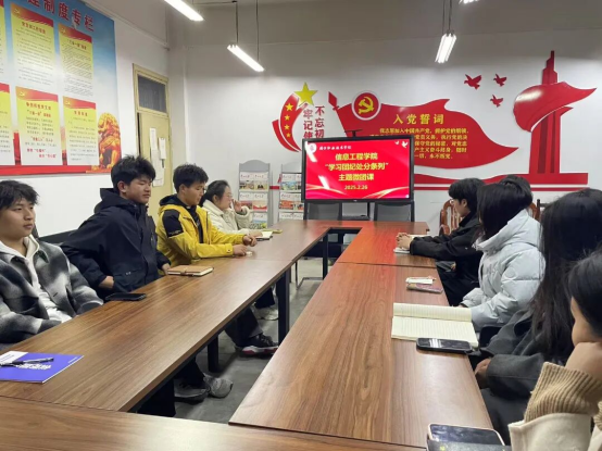 为深入学习贯彻党的二十大和二十届二中、三中全会精神,全面落实习近平总书记关于青年工作的重要思想,信息工程学院于5月15日在6140教室成功举办了“学纪明规知敬畏,正风笃行践初心”主题团日活动。此次活动旨在进一步铸牢中华民族共同体意识,充分发挥共青团组织的实践育人优势,强化对青年的政治引领和价值引领,增强基层团组织的活力,做好广大团员青年的思想引领工作。