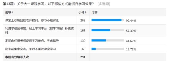 在课程学习提升方式的调查中,92.44% 的学生认为课堂上积极回应老师提问、参与小组讨论能有效提升学习效果,占比居首;57.39% 的学生选择利用学校图书馆、线上学习平台补充资料,44.67% 的学生会定期向任课老师反馈学习难点寻求指导,而仅12.71%的学生存在期末集中突击、忽视课堂学习的情况,反映出多数新生具备正确的学习方法认知。