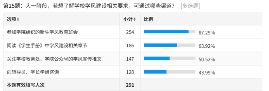 学风建设相关要求的了解渠道调查显示,87.29% 的学生通过参加学院新生学风教育班会获取相关信息,63.92% 的学生会阅读《学生手册》中学风建设章节,50.52% 的学生关注学校及学院公众号的学风宣传推文,43.99% 的学生选择向辅导员、学长学姐咨询,体现出学院线下教育与线上宣传相结合的学风普及模式成效显著。