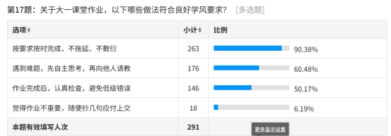 课堂作业规范方面,90.38% 的学生能够按要求按时完成作业,不拖延、不敷衍;60.48% 的学生遇到难题会先自主思考再请教他人;50.17% 的学生会在作业完成后认真检查。仅有6.19%的学生认为作业不重要并敷衍完成,展现了新生良好的作业学习习惯。