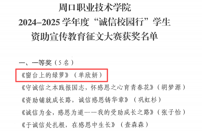 2025年5月15日,第18届河南省“诚信校园行”学生资助宣传教育活动校级评选结果公布,信息工程学院学子单欣妍同学的作品《窗台上的绿萝》凭借真挚的情感与深刻的立意荣获一等奖,该作品由王瑞雅老师与岳丽娜老师共同指导。