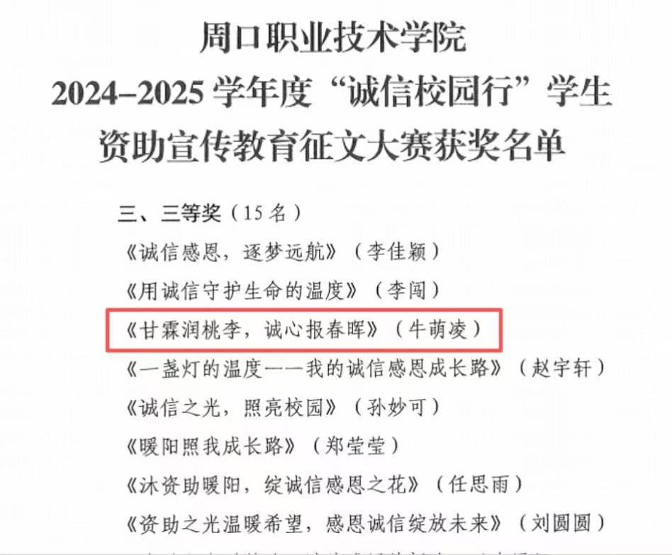 2025年5月15日,第18届河南省“诚信校园行”学生资助宣传教育活动校级评选结果公布,信息工程学院牛萌凌同学的作品《甘霖润桃李,诚心报春晖》凭借真挚的情感与鲜明的主题,荣获三等奖,该作品由王瑞雅老师与岳丽娜老师共同指导。